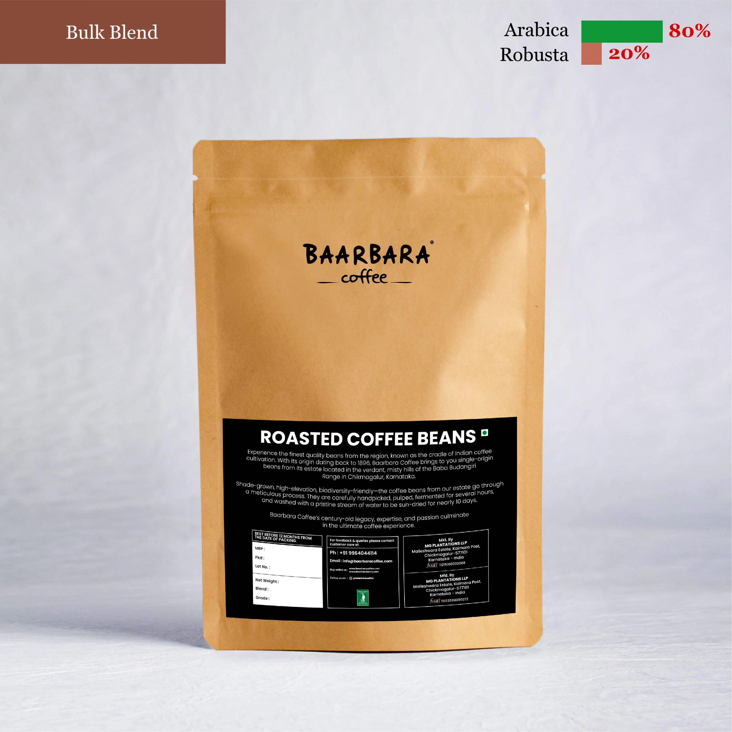 80% Arabica - 20% Robusta Roasted Coffee Beans Bulk Blend by Baarbara Coffee | Indian Coffee Beans | Indian Coffee Beans
