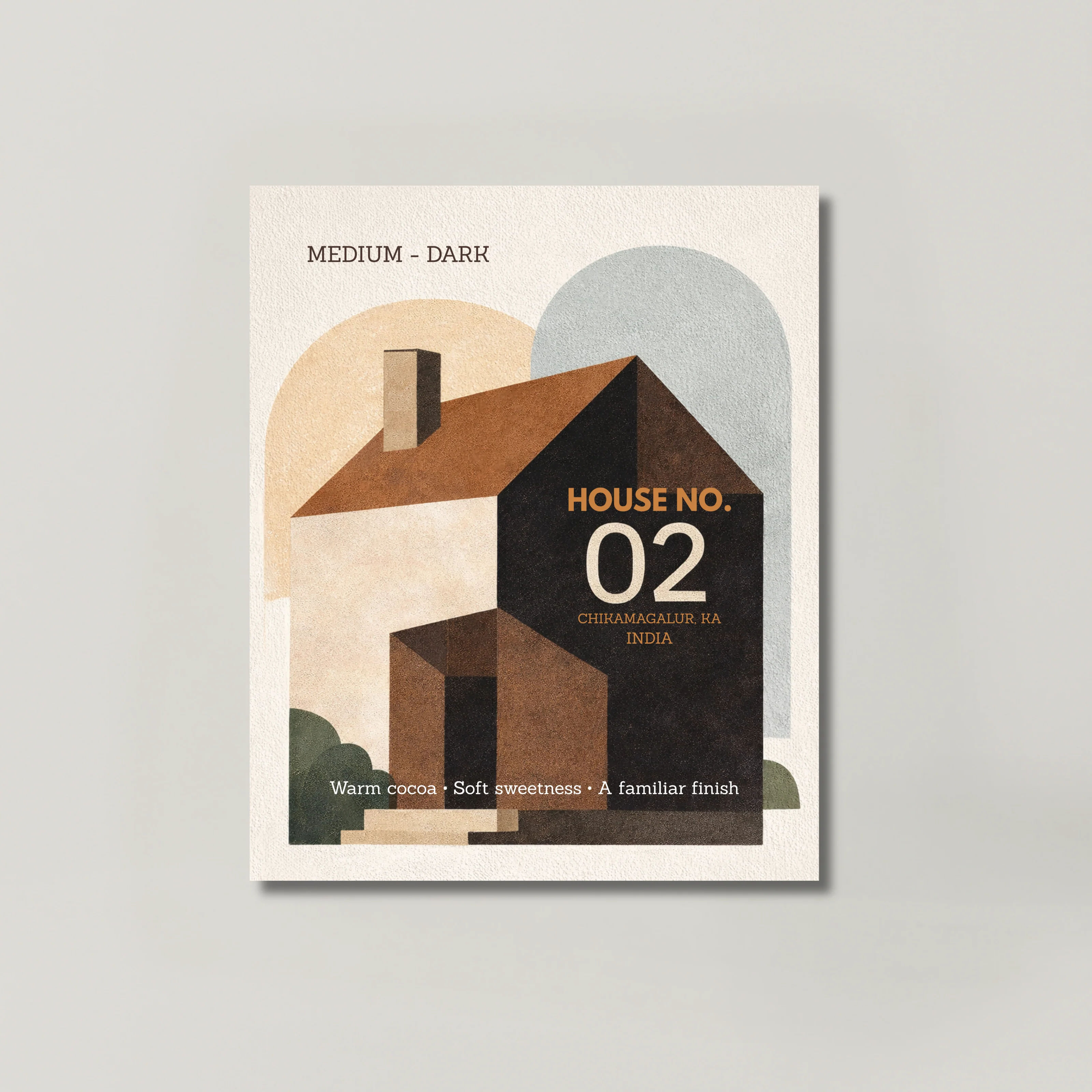 Warm Cocoa • Brown Sugar • A Familiar Finish A balanced, full-bodied espresso blend designed for everyday comfort. House No. 02 is the second release in our House Series — a lineup of coffees built around routine, consistency, and quiet familiarity. Built on a washed base from Chikamagalur, layered with arabica cherry for body, and finished with a touch of natural sweetness from Kaimara, this blend is smooth, rounded, and deeply satisfying. Expect a cup that leans into warmth soft cocoa notes, gentle brown sugar sweetness, and a full, comforting body that holds beautifully across brew styles. It’s easy to drink, easy to dial in, and hard to replace once you get used to it. Designed for everyday use, House No. 02 performs just as well with milk as it does black. Whether it’s your morning espresso or an evening cup, this is the kind of coffee you reach for without thinking.